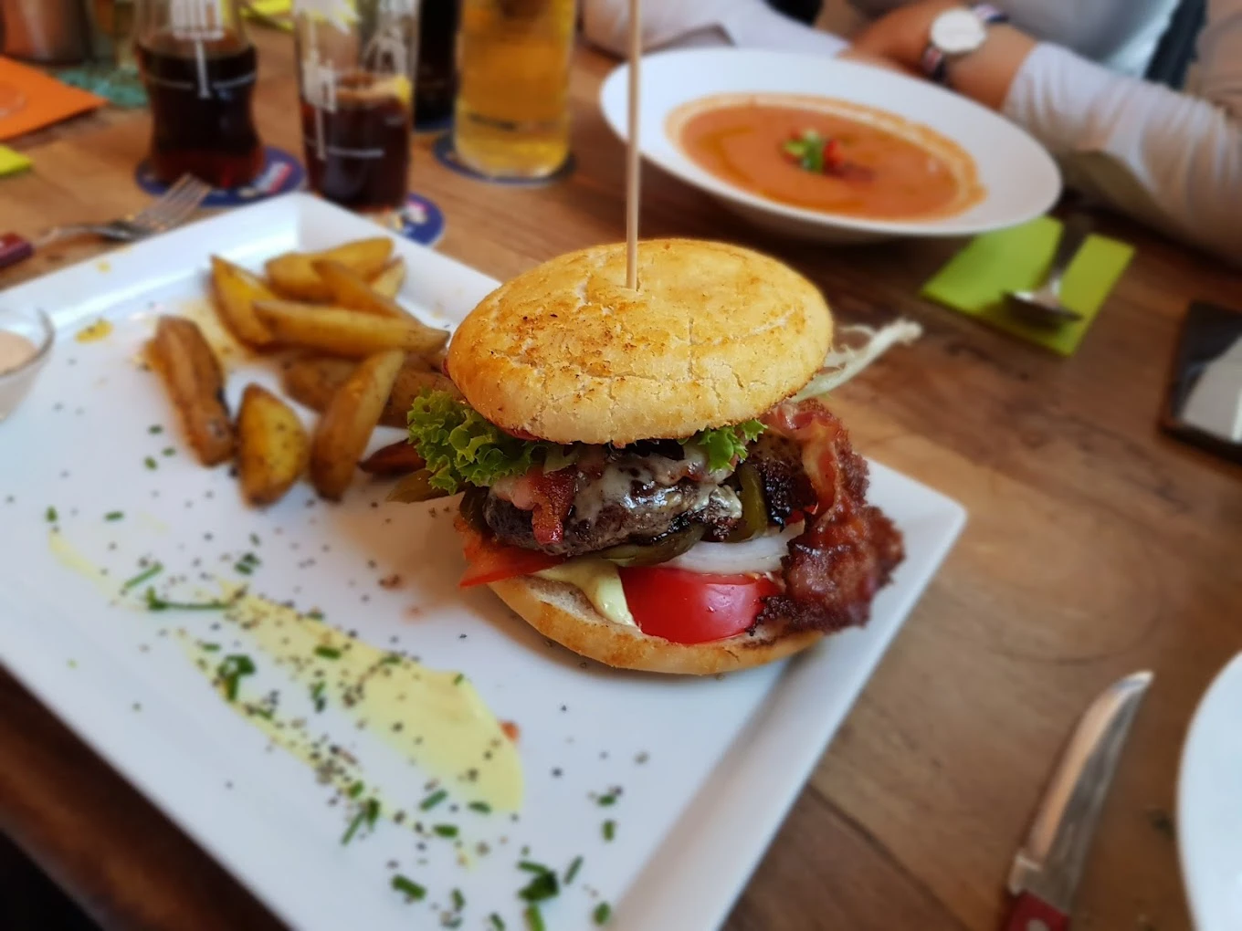 Entdecke unsere kreativen Burger, die mit ihren raffinierten Kombinationen und saftigen Patties überzeugen. Ob mit knusprigen Pommes oder einem erfrischenden Getränk – unser Treffpunkt bietet dir das perfekte Ambiente für gemütliche Abende mit Freunden. Genieße die mitreißende Musik und die herzliche Bedienung und lass dich von unserem kulinarischen Können begeistern.